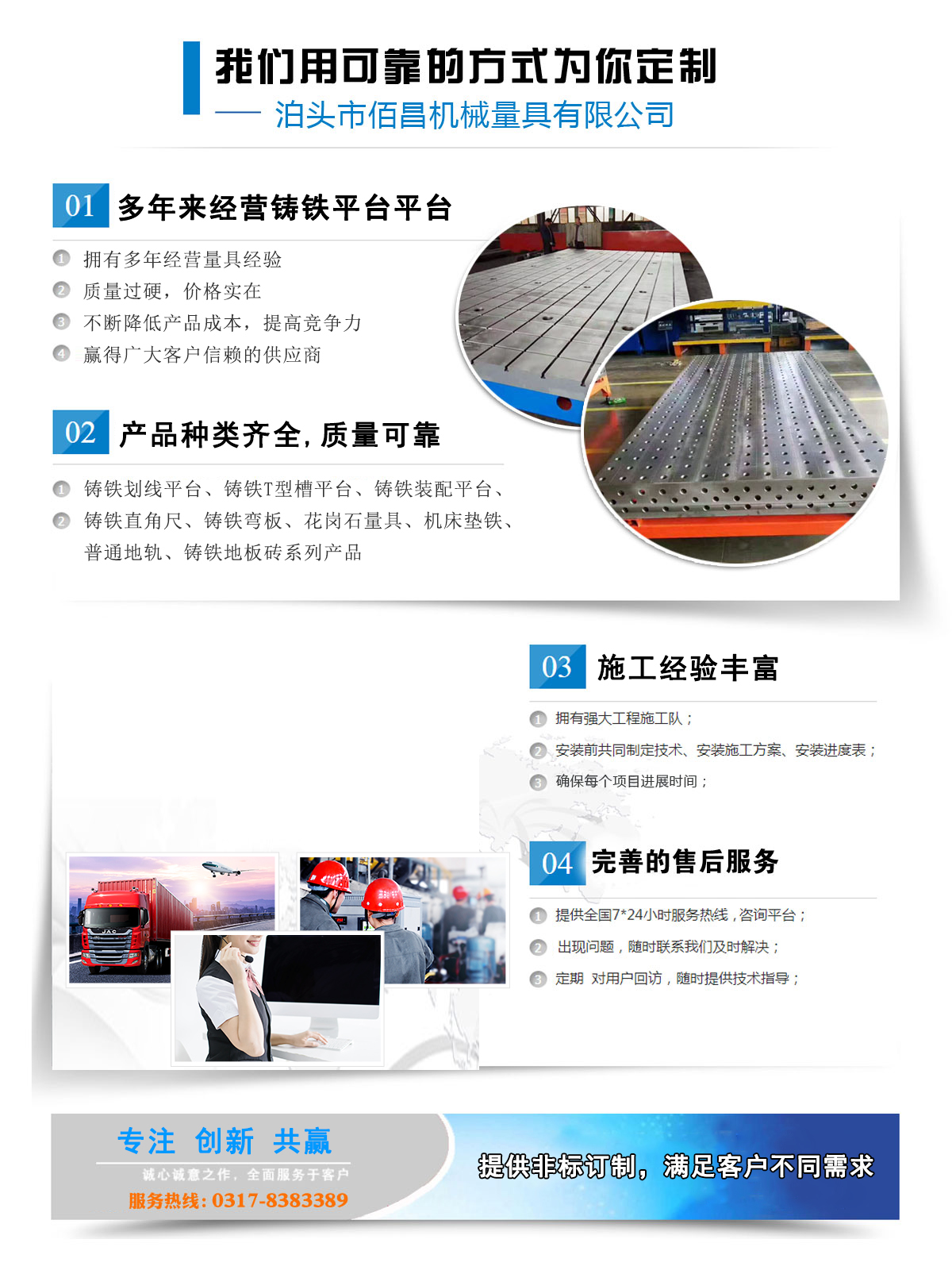 泊頭市佰昌機械量具有限公司坐落在有“鑄造之鄉”美稱的泊頭市,我公司自創建初期堅持誠信原則和不斷創新的原則,_為廣大用戶提供鑄鐵平板,鑄鐵地板劃線平臺等放心產品,我們的產品_程度高,得到了廣大用戶的高度認可。